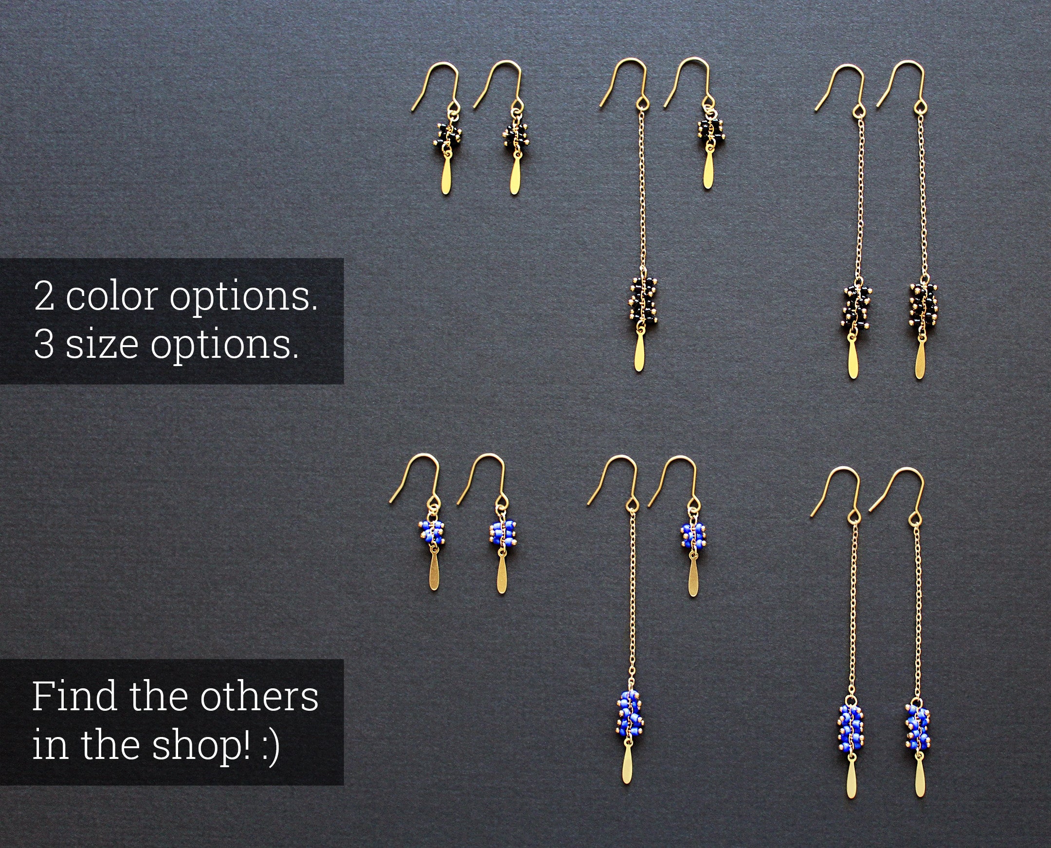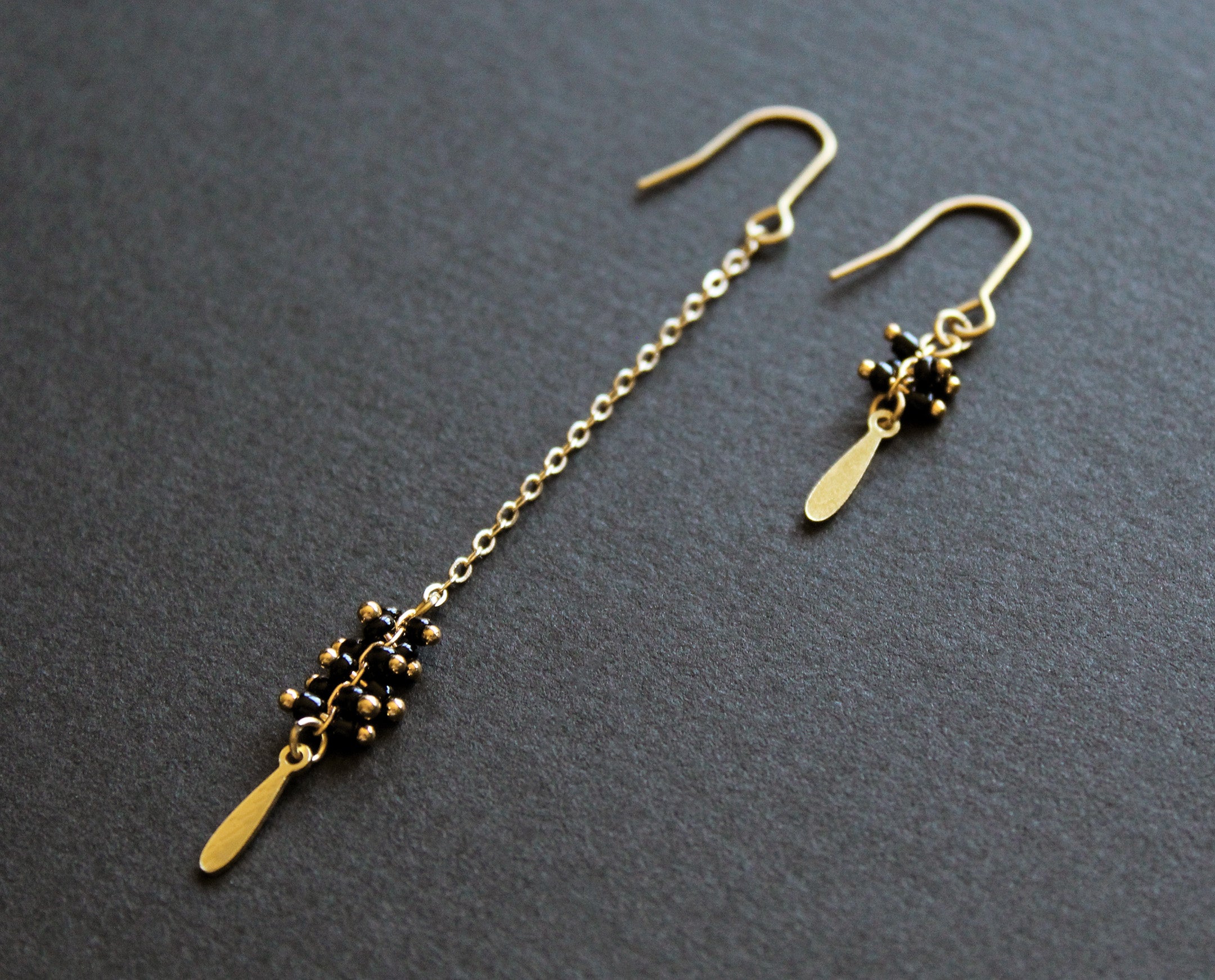 These handcrafted lightweight earrings feature elegant bead clusters in black, as well as golden brass drops, assembled in an asymmetric design for a in a cool look that easily complements any occasion. Understated yet striking, they're the perfect choice for those seeking unique jewelry that transitions seamlessly from day to evening.