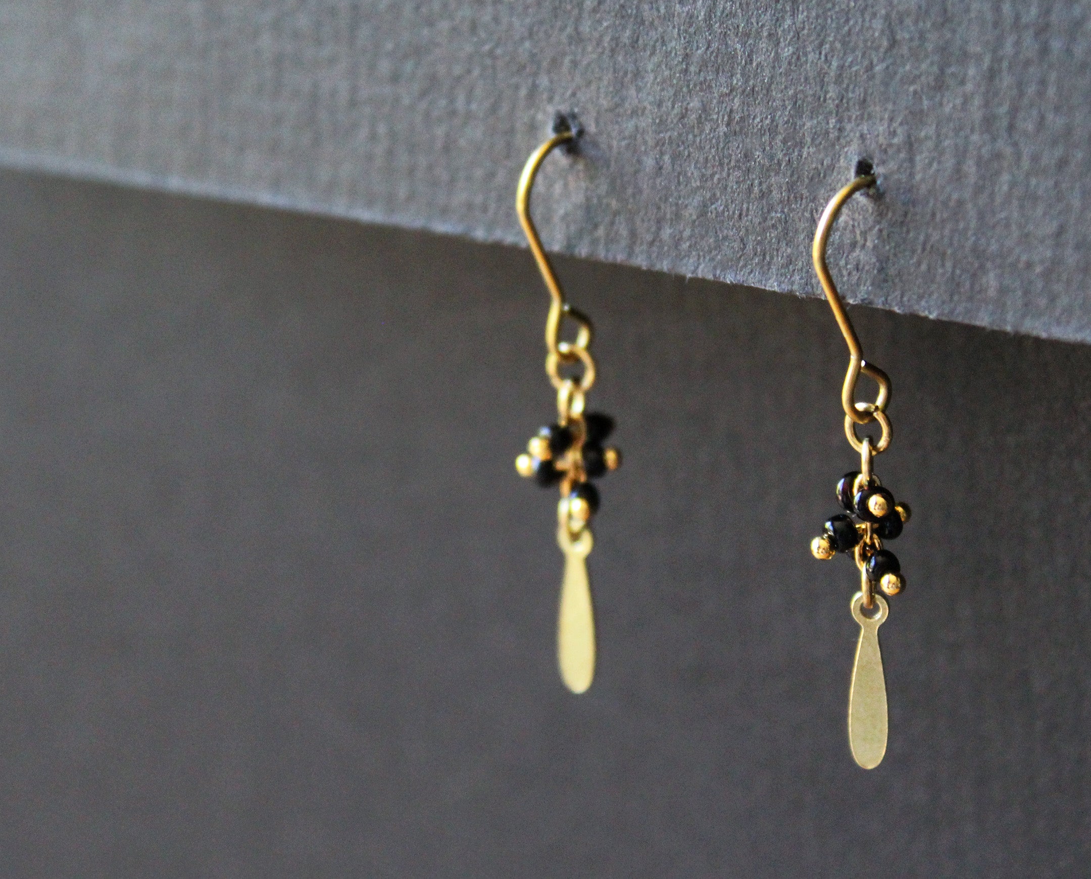 These handcrafted earrings feature elegant bead clusters in black, as well as golden brass drops, complete in a refined short dangle that easily complements any occasion. Understated yet striking, they're the perfect choice for those seeking lightweight jewelry that transitions seamlessly from day to evening.