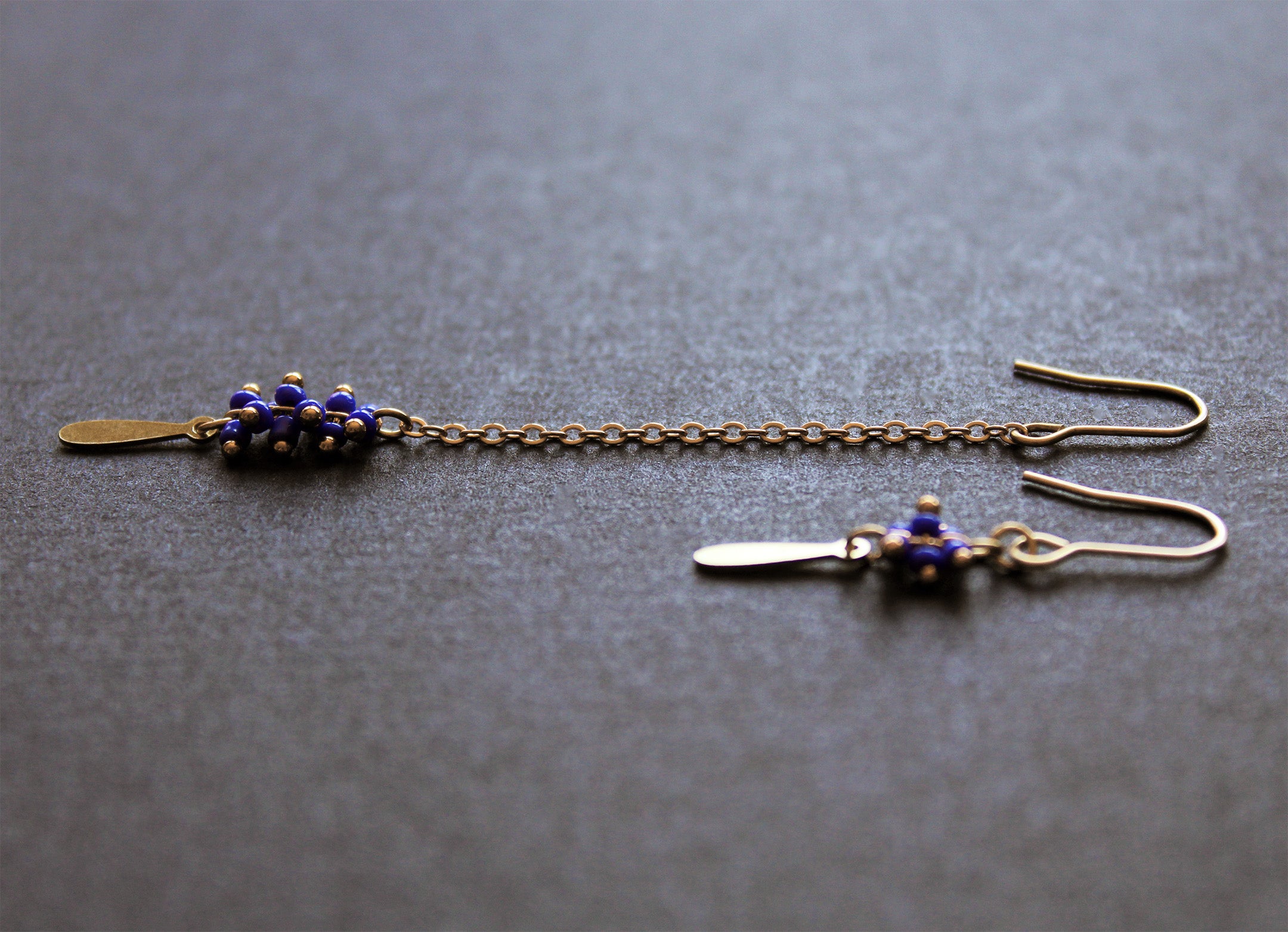 These handcrafted lightweight earrings feature elegant bead clusters in blue, as well as golden brass drops, assembled in an asymmetric design for a in a cool look that easily complements any occasion. Understated yet striking, they're the perfect choice for those seeking unique jewelry that transitions seamlessly from day to evening.